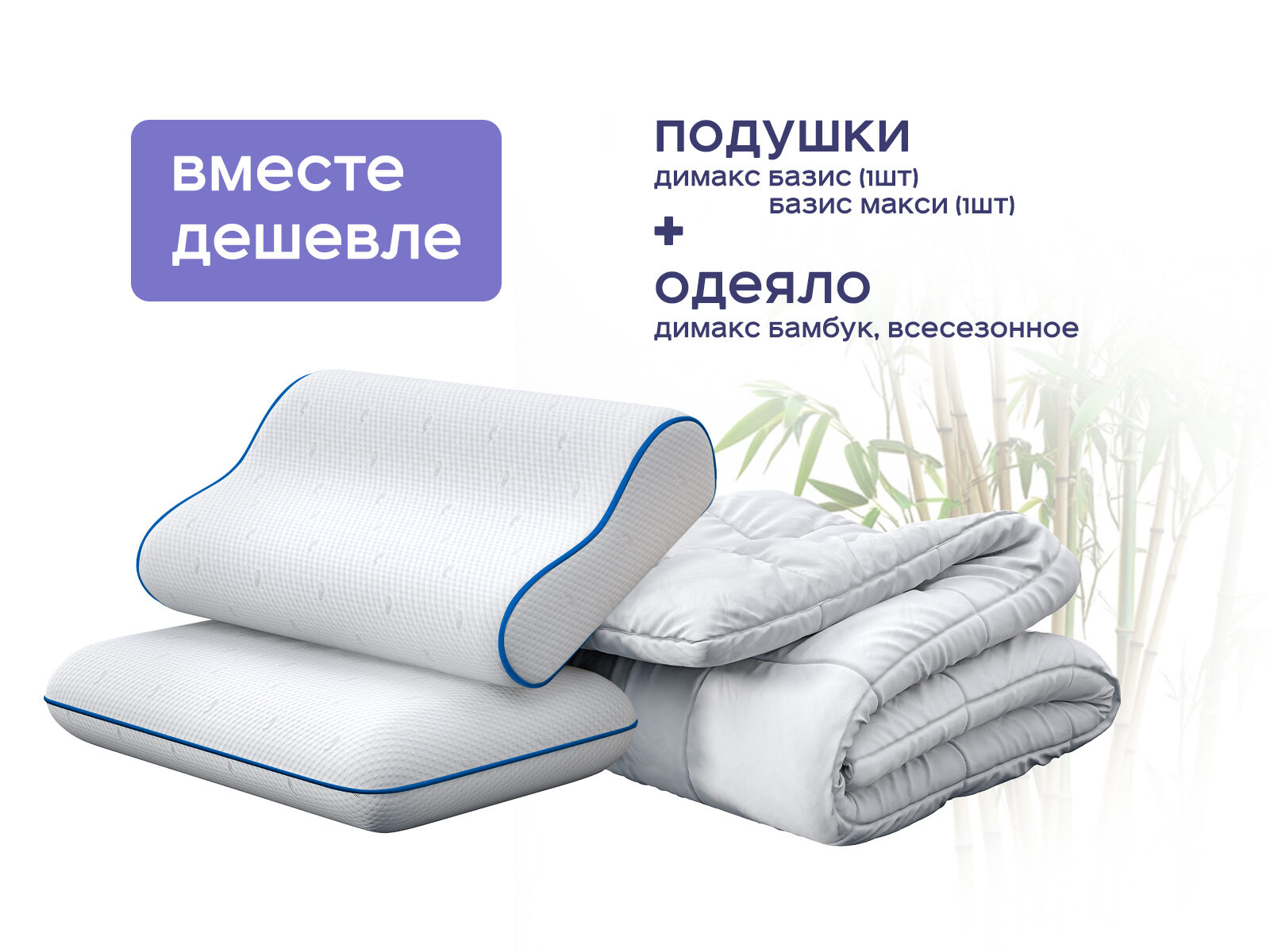 Комплект одеяло Димакс Бамбук всесезонное + подушка Димакс Базис 1 шт. + подушка Димакс Базис Макси 1 шт. — ваш персональный конструктор идеального сна. Покупая набор, вы экономите до 48% и получаете всё для здорового отдыха: терморегулирующее бамбуковое одеяло, классическую подушку с эффектом памяти и анатомическую модель с волнообразной поддержкой. Сочетайте подушки под настроение, позу или физическое состояние — этот комплект адаптируется к вашим потребностям, как умный ассистент сна.