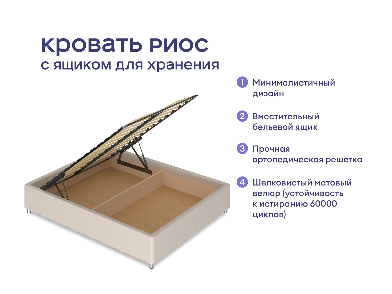 Оформлена в изящном минималистичном стиле. В модели отсутствуют изголовье, что позволяет универсально вписать мебель в большинство современных интерьеров. Простые и лаконичные линии кроватного бокса оставляют акцент на главном – удобной зоне отдыха и красивых пропорциях. Коробочный каркас кровати собран из ДСП. В качестве обивки модели выступает велюр. В комплект входит ортопедическое металлическое разборное основание с подъемным механизмом.