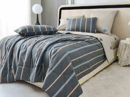 В комплект входит легкое, мягкое, летнее одеяло. Его можно стирать вместе с другим бельем, оно быстро сохнет и после стирки его не нужно гладить.