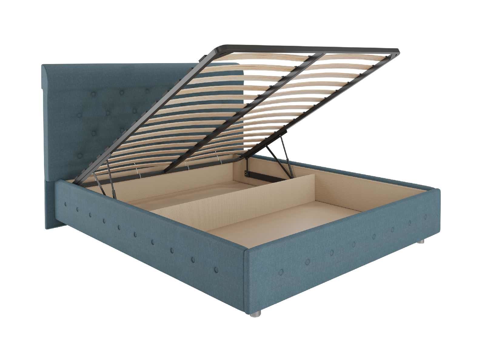 Кровать комплектуется основанием с подъемным механизмом. При желании основание всегда можно поднять и получить доступ к вместительному бельевому ящику. Это дополнительная система для хранения постельных принадлежностей. Она позволит разгрузить шкаф и спрятать сезонные вещи.