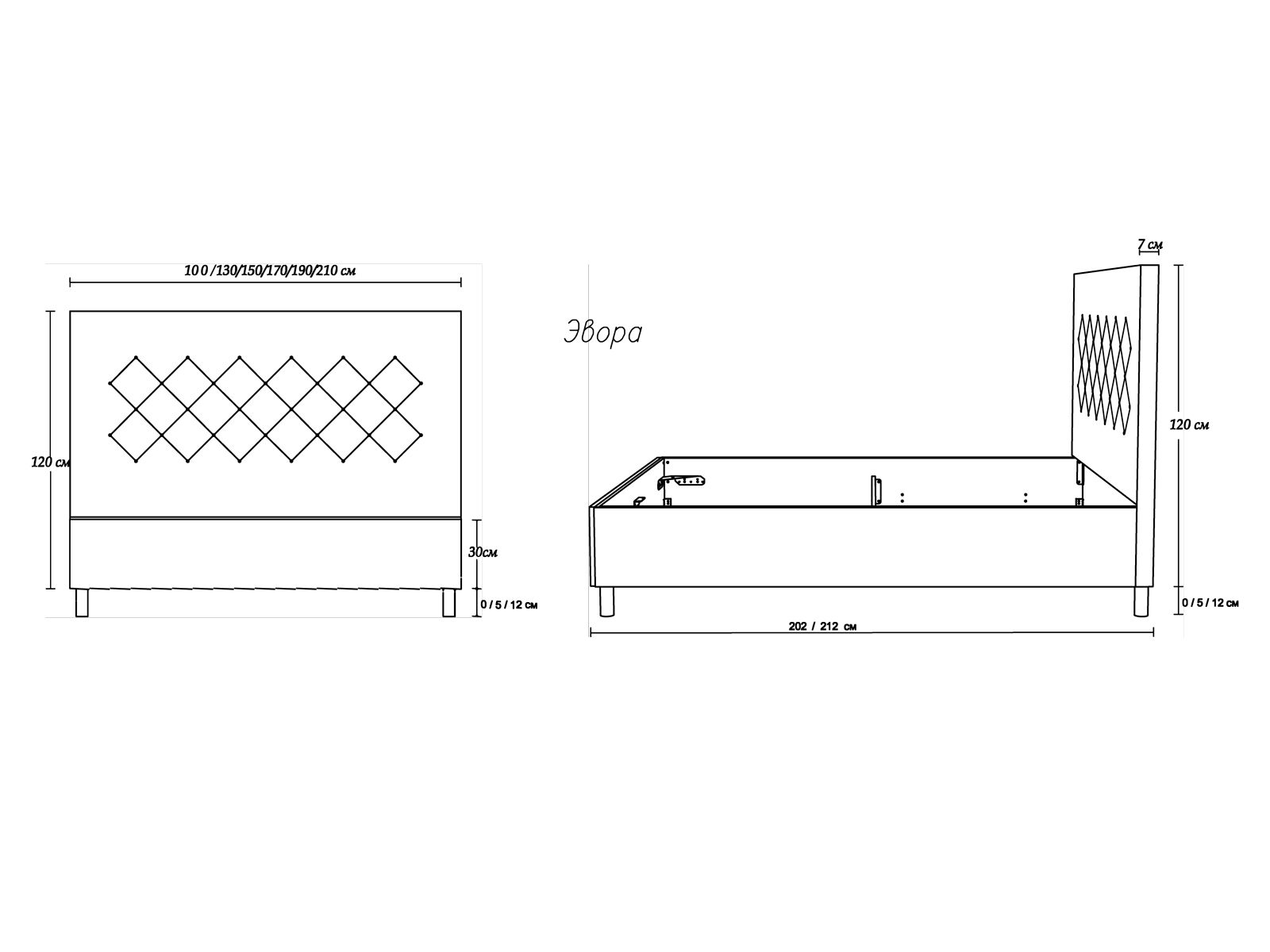 Металлические опоры можно выбрать из двух вариантов высоты – 5 см и 12 см. Кровать Эвора может быть представлена также без опор.