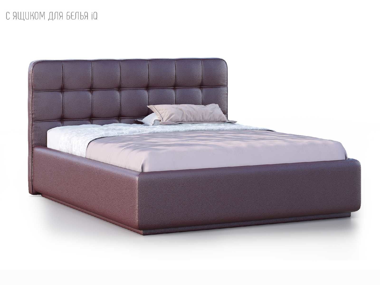 Кровать укомплектована IQ с подъемным механизмом и ящиком для белья без дна (дополнительная платная опция - дно к ящику IQ из HDF (ХДФ). Каркас кровати на цоколе, декоративный чехол на цоколе съёмный. Глубина ящика для белья - 30 см, без ограничения нагрузки на ящик.