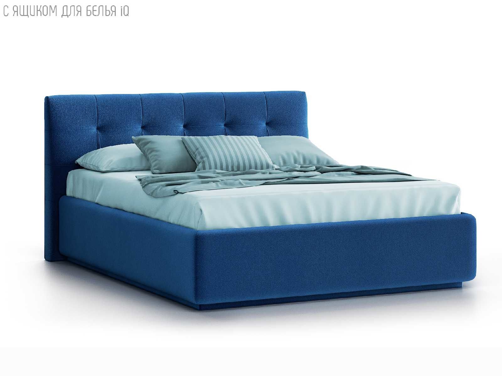 Кровать укомплектована IQ с подъемным механизмом и ящиком для белья без дна (дополнительная платная опция - дно к ящику IQ из HDF (ХДФ). Каркас кровати на цоколе, декоративный чехол на цоколе съёмный. Глубина ящика для белья - 30 см, без ограничения нагрузки на ящик.