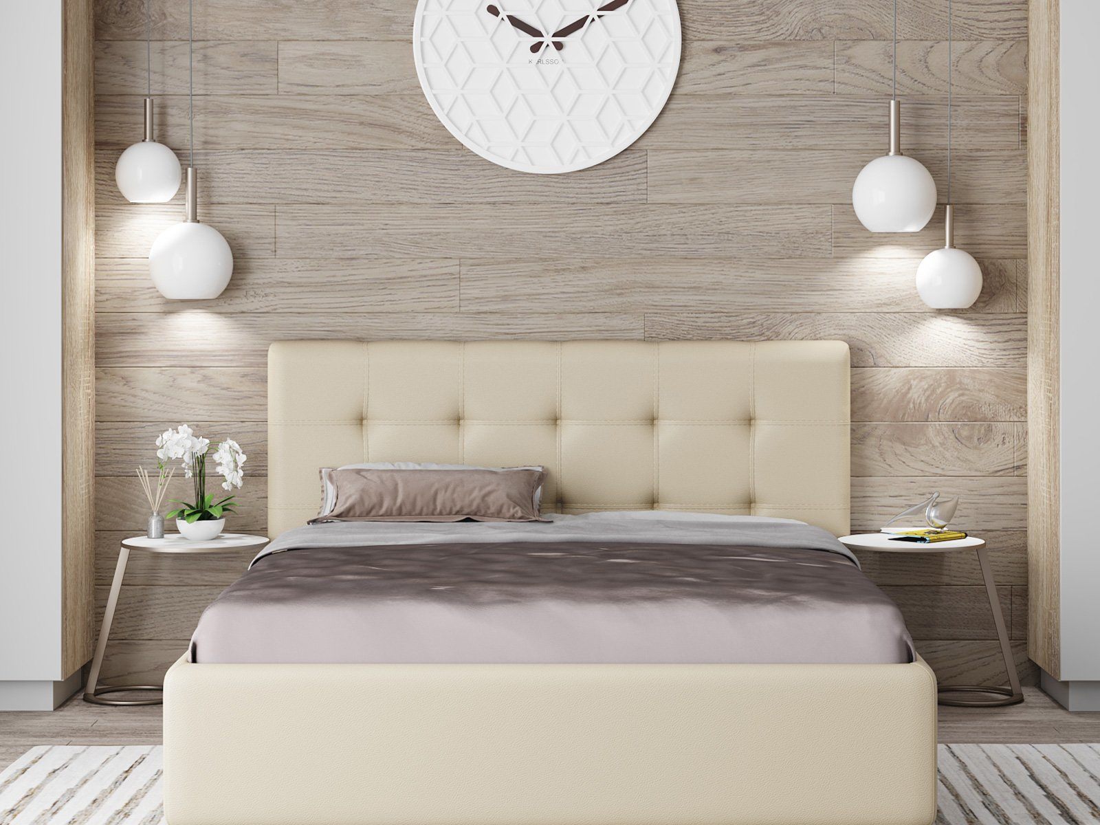 Компактная кровать «Сабина» с мягким изголовьем, декорированным стежкой «квадрат», идеальный вариант для интерьеров в современном стиле или малогабаритных квартир.