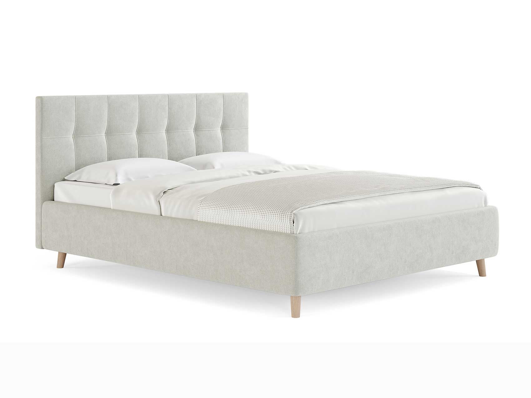 Двуспальная кровать с мягким изголовьем подойдет для современных интерьеров спален, а благодаря высоким деревянным ножкам впишется в стиль ретро, скандинавский или минимализм.