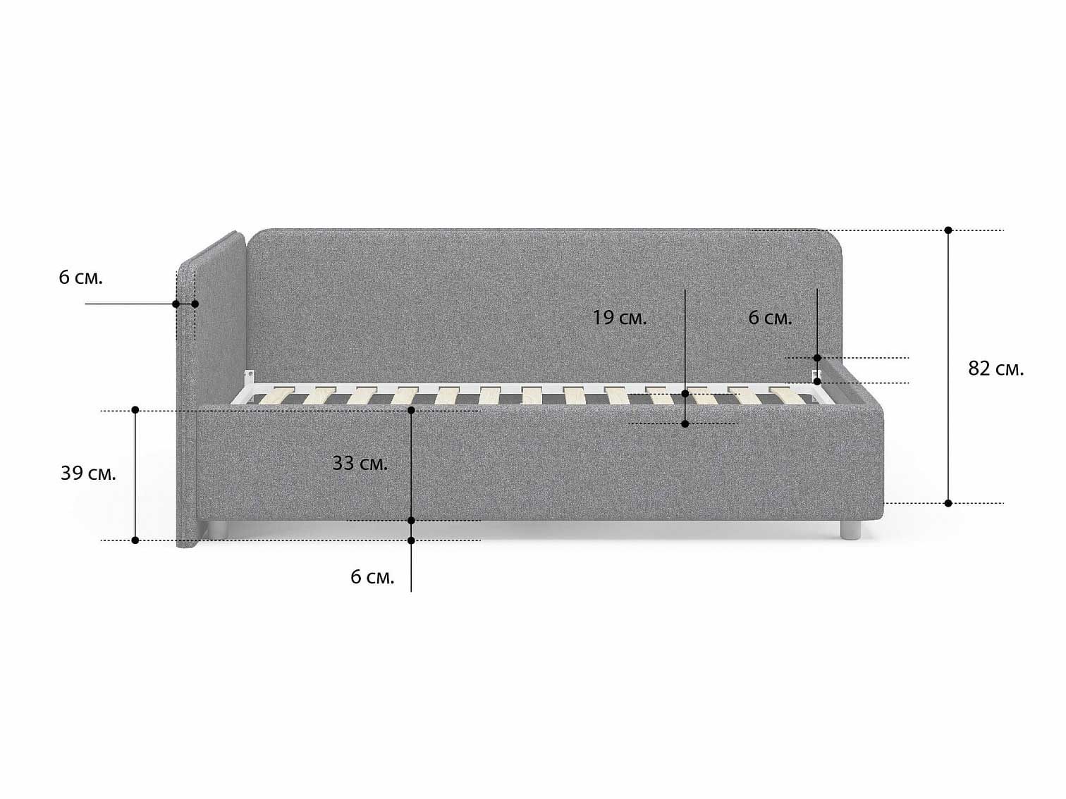 Односпальная кровать в современном стиле. Кровать-софа с одной боковой спинкой. Идеально подходит для квартир с небольшой площадью, детских и подростковых спален, гостевых комнат. Боковую спинку кровати можно изготовить на выбор на правую или левую сторону. Модель изготовлена из ДСП.