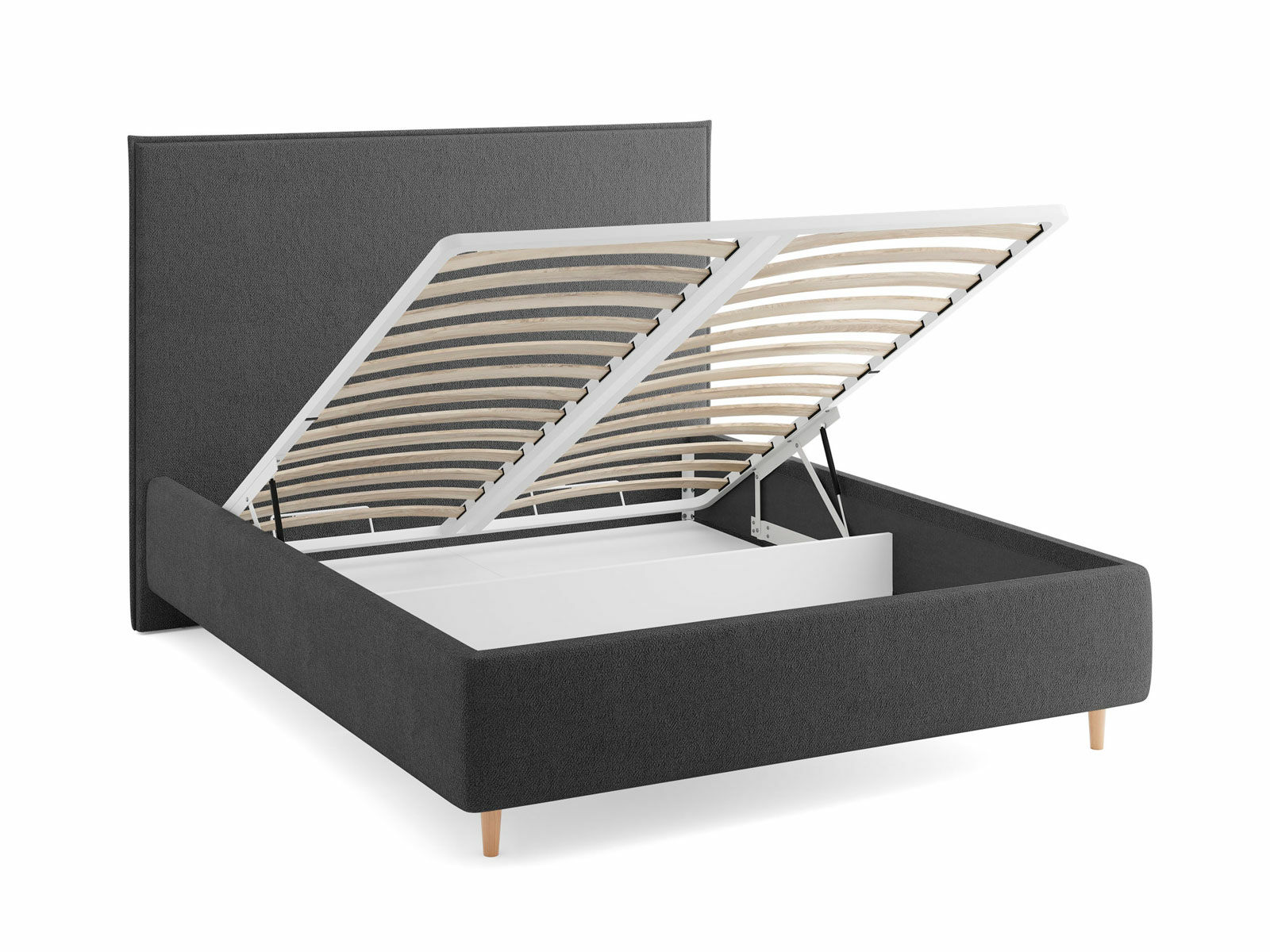 Кровать комплектуется металлическим основанием и подъемным механизмом со вместительным бельевым ящиком. Дно бельевого ящика легко сдвигается для обеспечения уборки под кроватью.