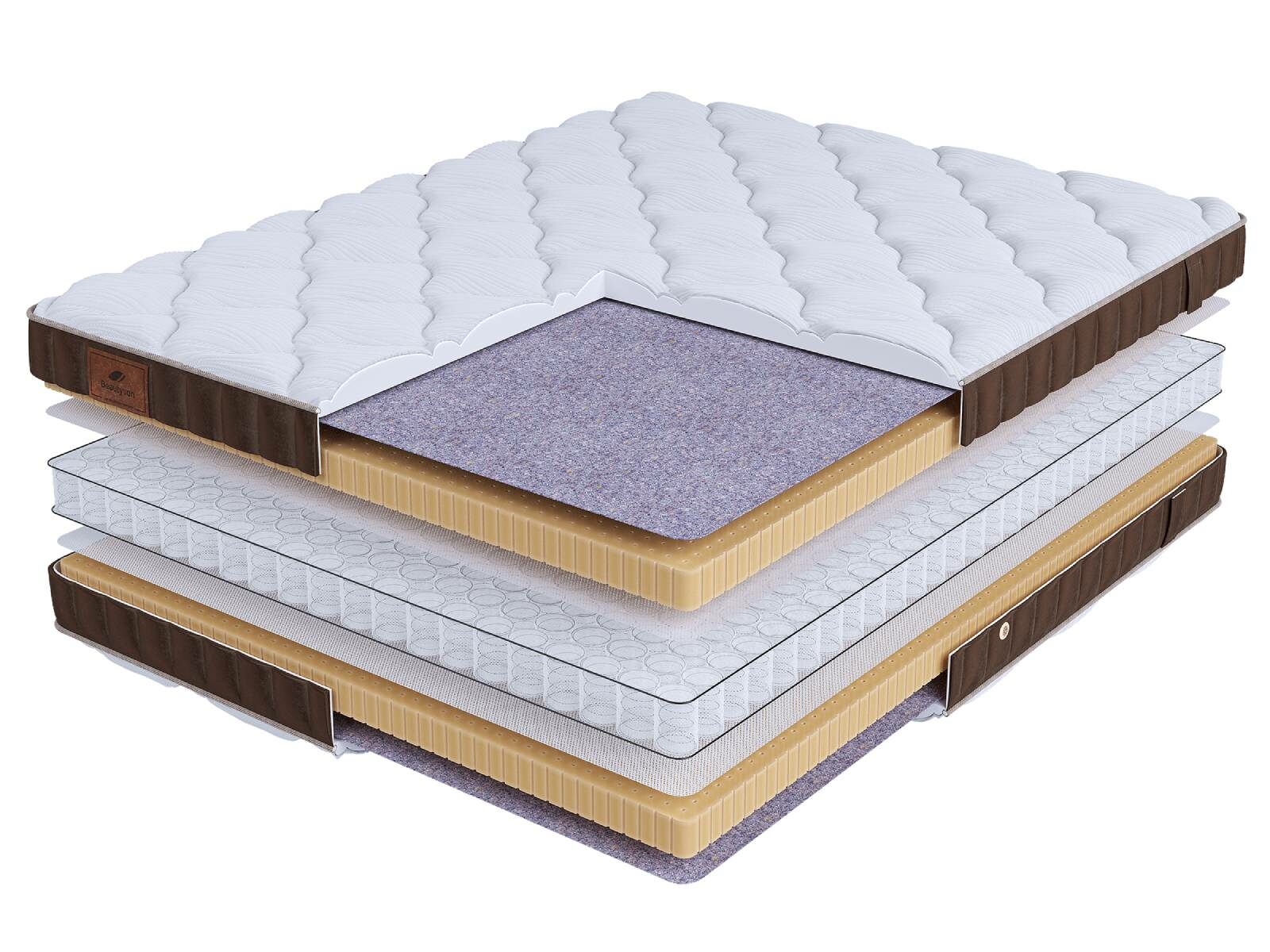 Хлопковая трикотажная ткань чехла обеспечивает комфорт и обладает отличной воздухопроницаемостью. Высокообъемная стежка с использованием холлофайбера (600гр.) подарит дополнительный комфорт спальному месту. Изысканный бурлет из мягкого велюра красивого бежевого цвета придает матрасу роскошный внешний вид и подчеркивает его премиальный статус. Каждая модель серии LIFE украшена фирменной кожаной биркой BeautySon, подтверждающая исключительность каждого матраса.