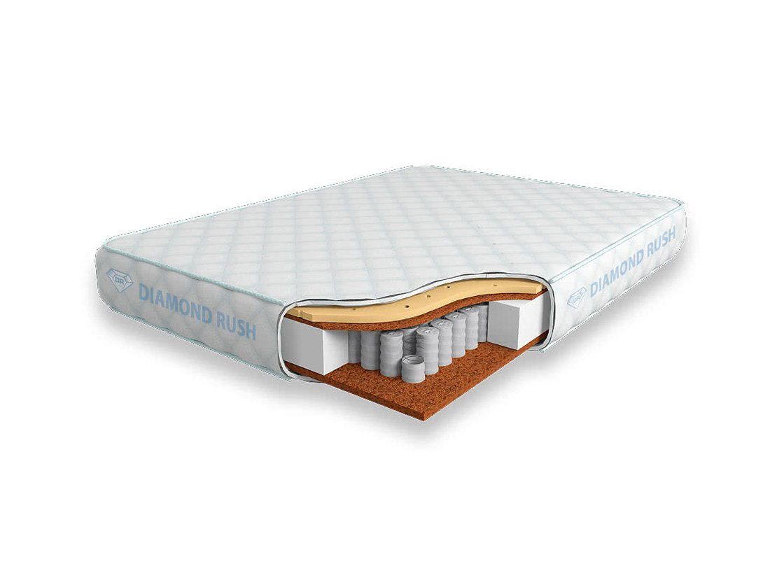 Матрас Diamond Rush Cocos Ergo-2 725DR имеет в своей основе независимый пружинный блок 725, состоящий из пружин диаметром 5-6 см. В качестве настилочных слоев поверх пружинного блока используются листы латексированной кокосовой койры (1 и 2см) и перфорированного натурального латекса (2см). Матрас является упругожестким с одной стороны и среднежестким с другой.