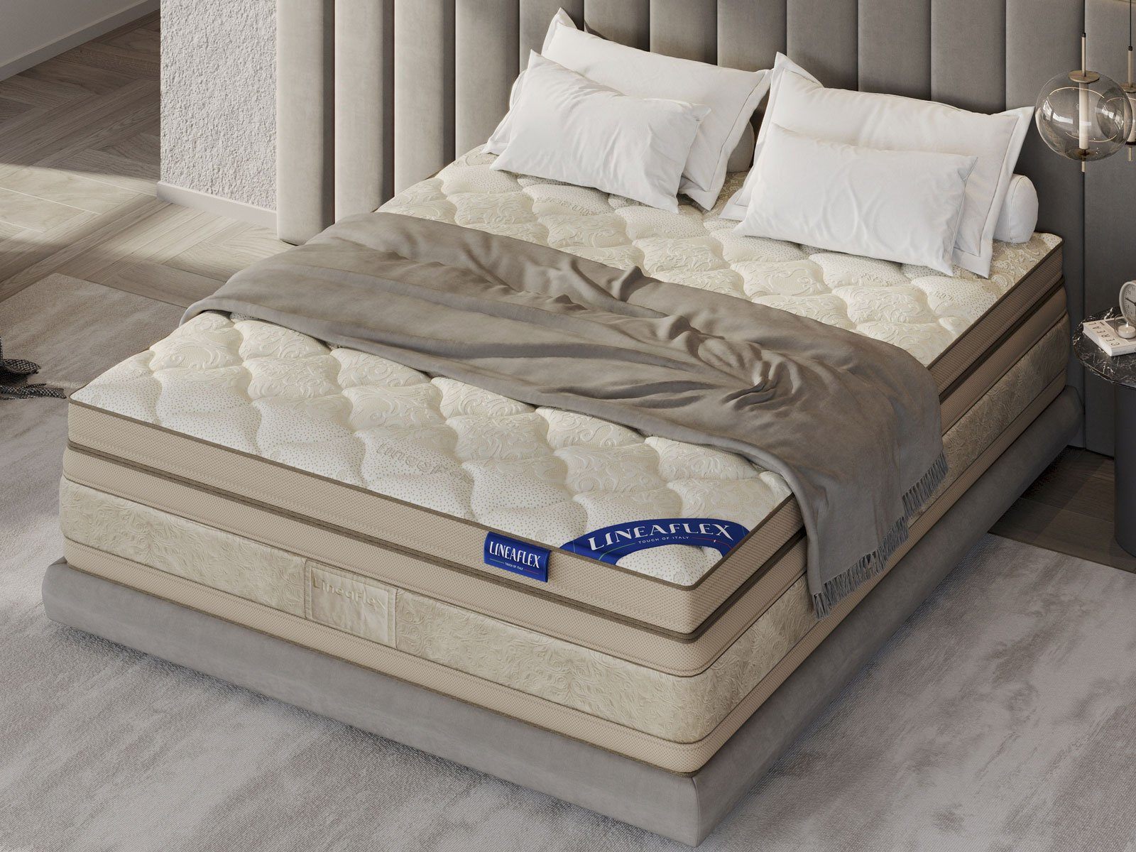Обивка изготавливается из вискозной ткани с добавлением полиэстера для носкости, которую дополняет эксклюзивное наполнение стежки холлофайбером. Боковина матраса шьётся из 100% воздухопроницаемой ткани 3D SPACE.