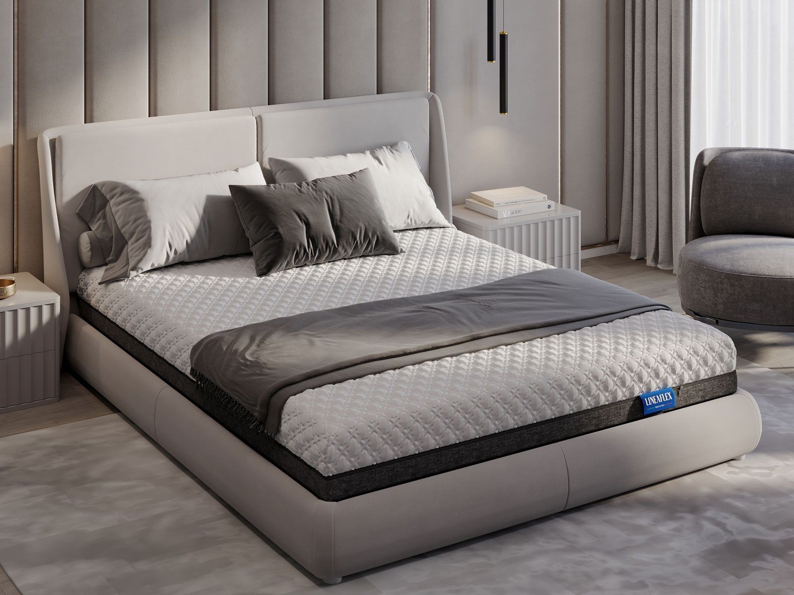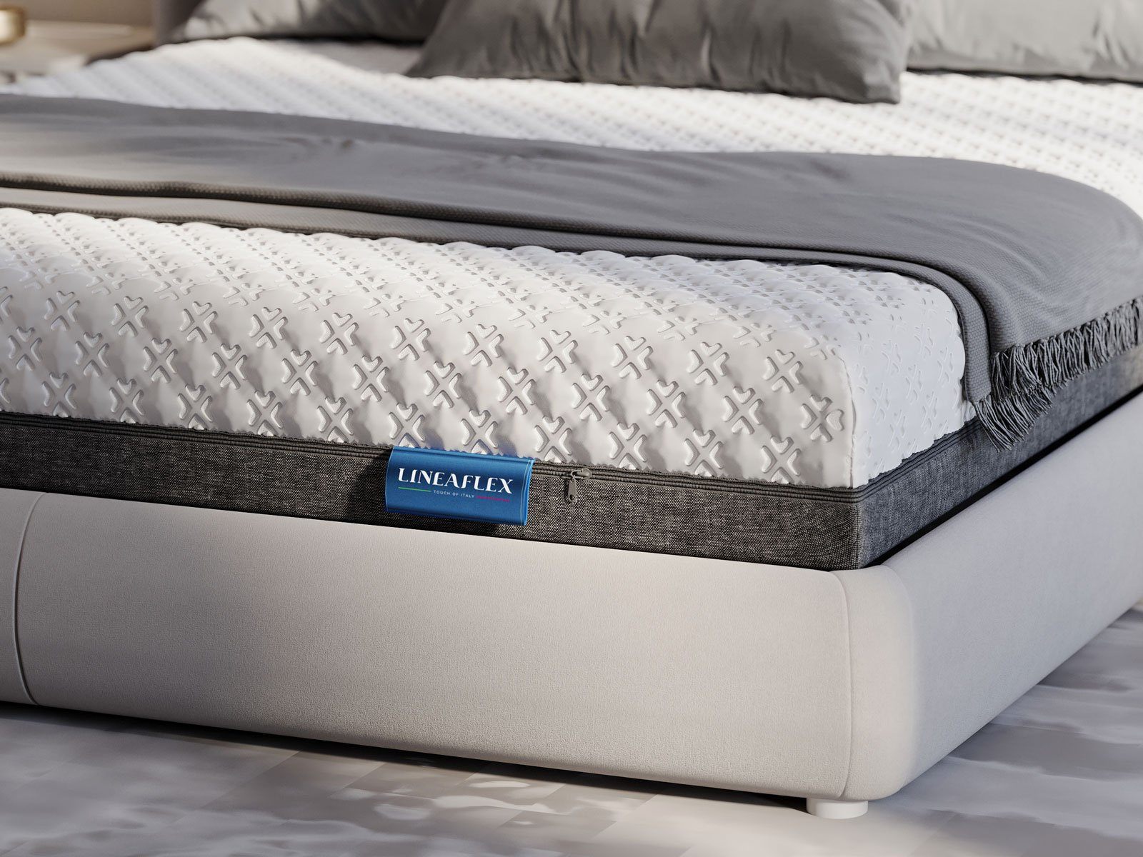 Для обивки модели реализован чехол SkyTouch Black&White, который при желании можно легко снять. Премиальный трикотаж чехла состоит из двух половин. Первая сторона - это плотный трикотаж без стежки, вторая сторона - это премиальный трикотаж с массажными подушечками. Материал создает очень комфортное и уютное покрытие.
