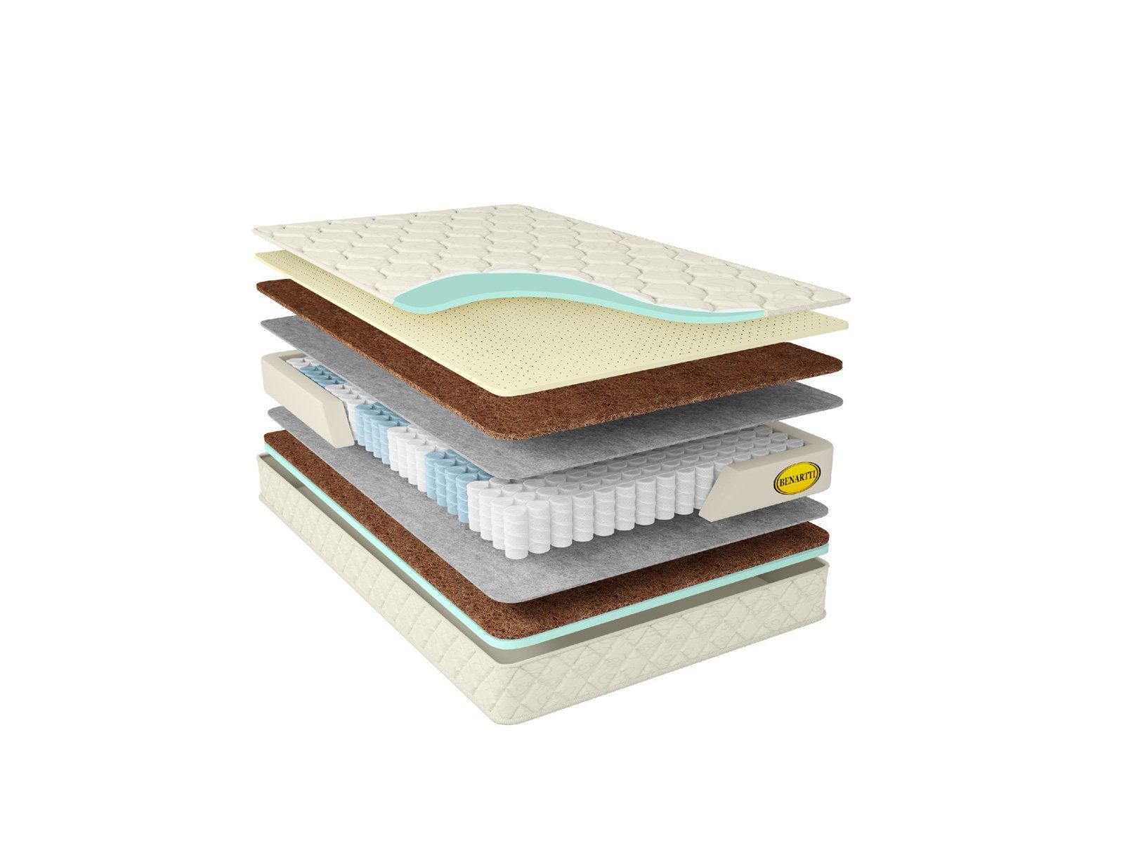 С обоих сторон от пружин стоят слои наполнителей. Они регулируют жёсткость спальных поверхностей, их комфортность и адаптивность. Верхняя поверхность представлена латексом в тандеме с кокосом, поэтому она более мягкая и уютная. Нижняя поверхность жёстче, благодаря тому, что здесь установлена одна лишь койра. Плита обеспечивает сторону хорошей ортопедической поддержкой.