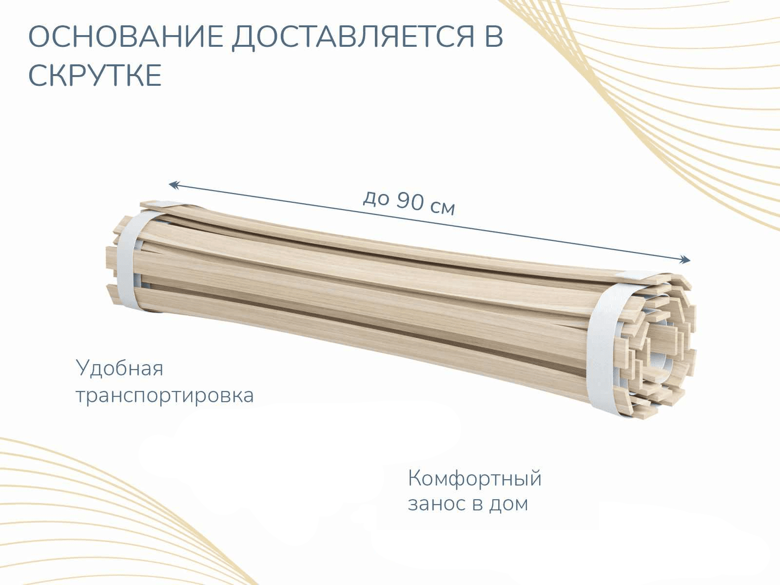 Конструкция основания выполнена из легкой прочной ленты и дополнена амортизирующими березовыми ламелями. Их изогнутая форма обеспечивает им гибкость и упругость, благодаря чему ламели могут пружинить при надавливании.