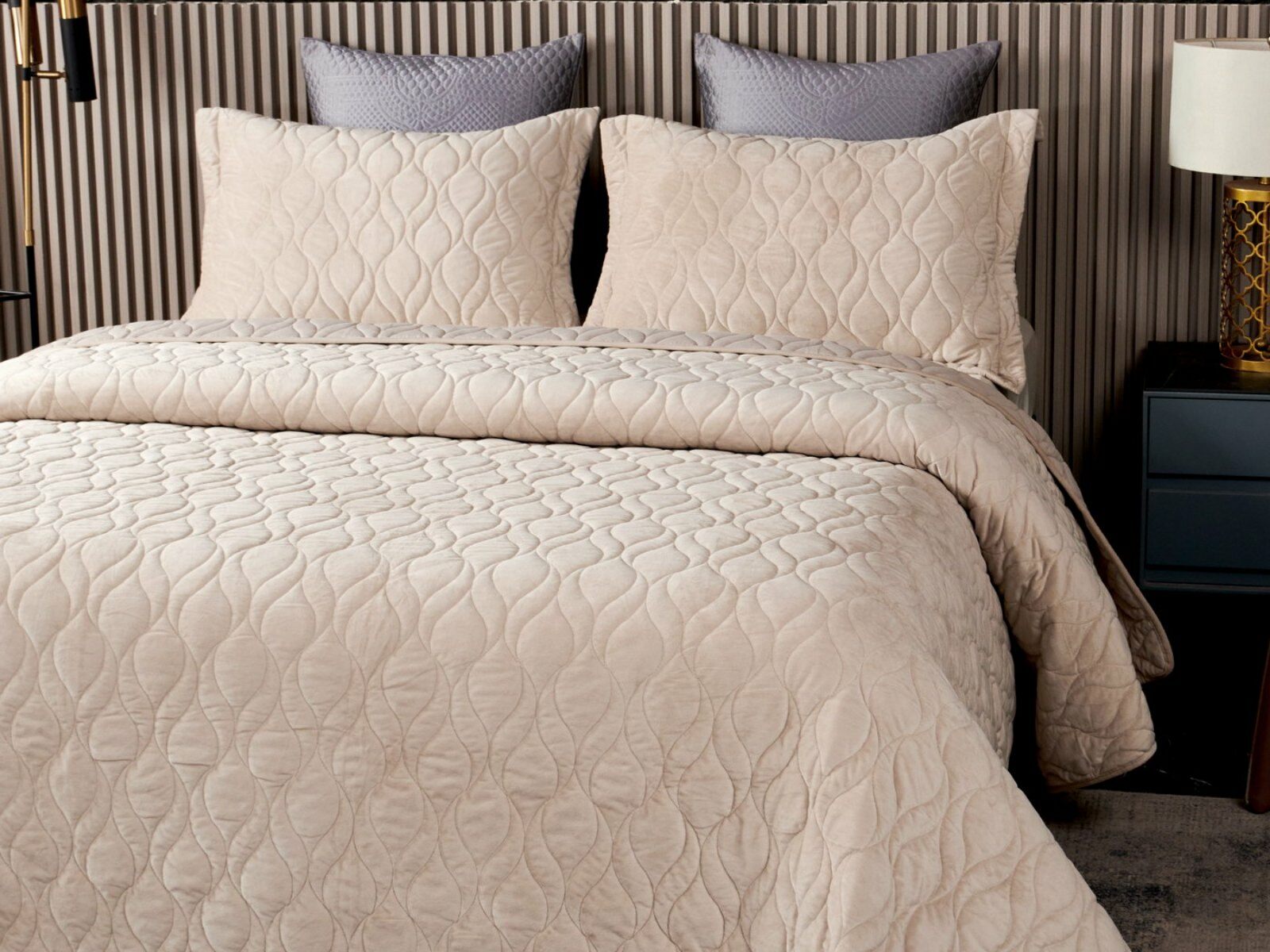 Покрывала и наволочки изготовлены из велюра высокой плотности - приятной на ощупь бархатистой ткани с коротким ворсом. Пошив покрывала с кантом, наволочки с ушками 5 см.