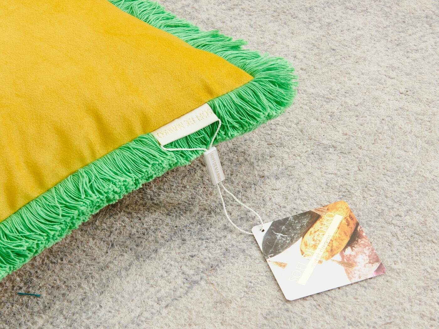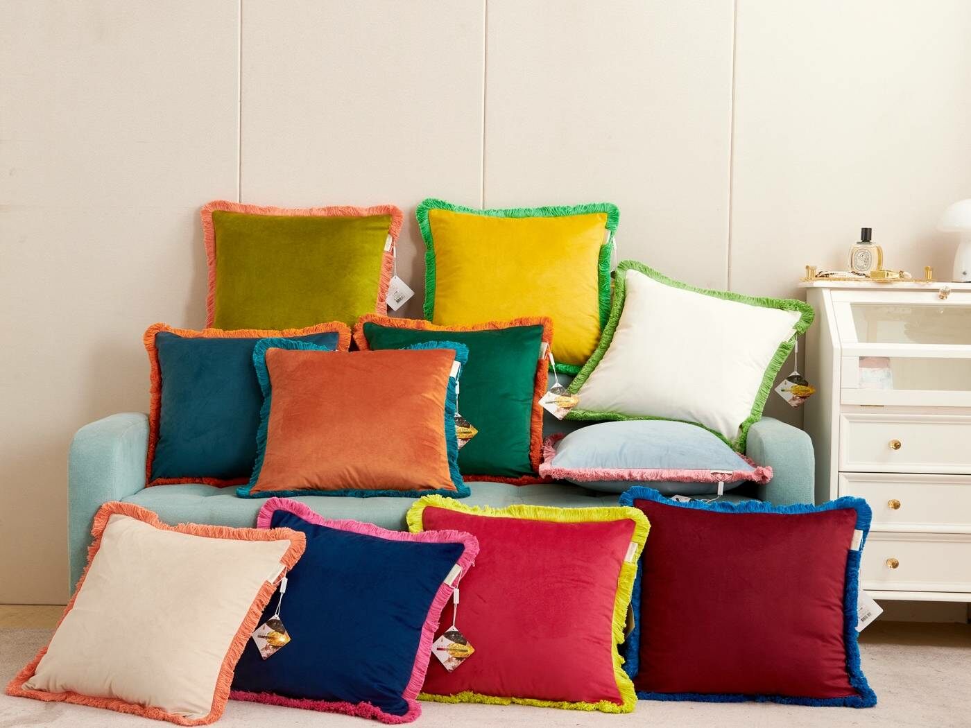 Коллекция пошита из мягкого и приятного на ощупь велюра плотностью 250г/м2. Наволочки с контрастной хлопковой бахромой добавят ярких акцентов и жизнерадостности в ваш интерьер. Большой выбор расцветок поможет расставить цветовой акцент и подчеркнет индивидуальность Вашей гостиной.