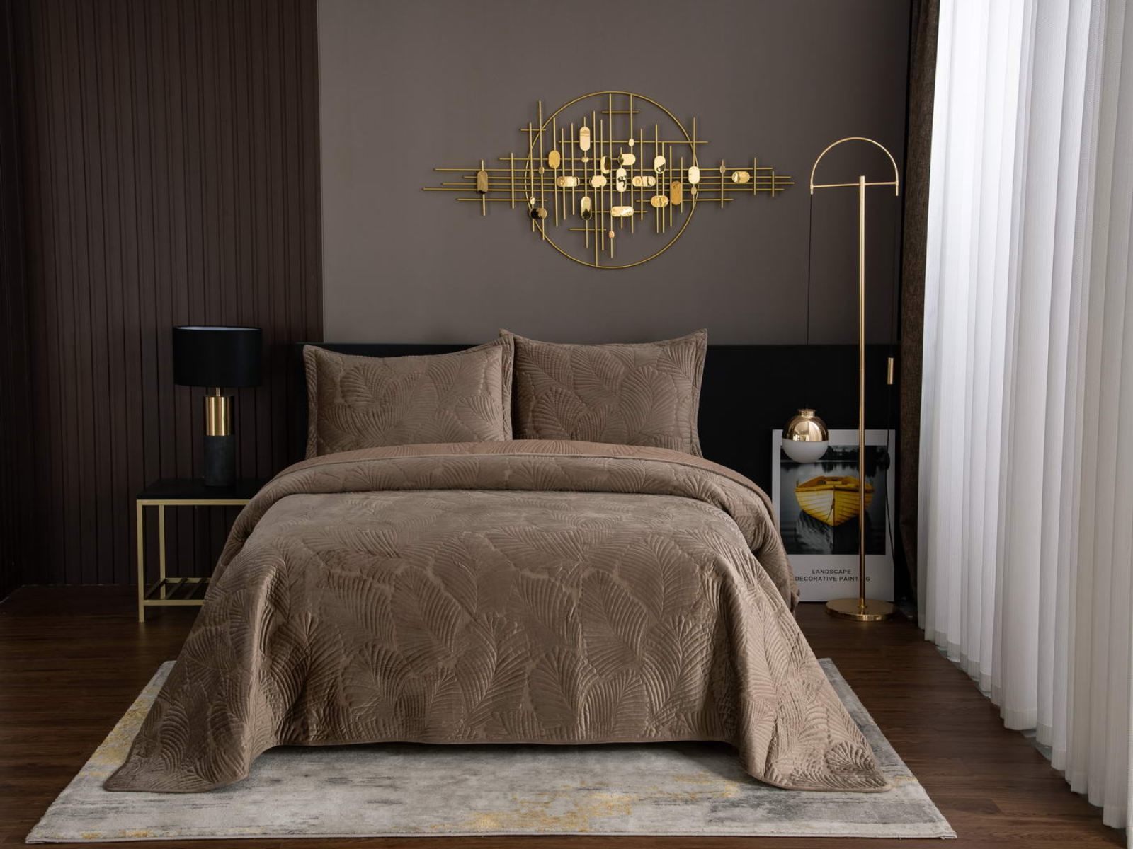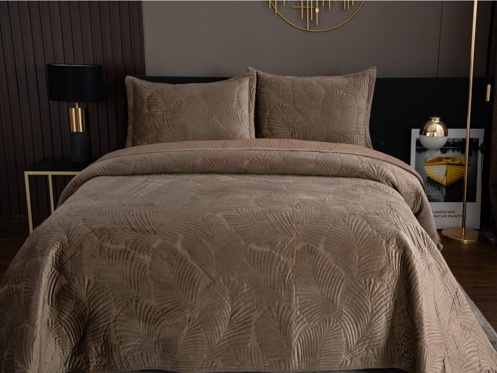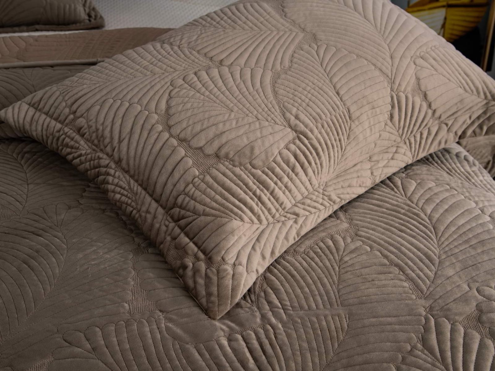 На создание велюрового покрывала Ноэль наших дизайнеров вдохновила ночь в середине лета, когда на раскаленную от жары землю спускается долгожданная прохлада. Роскошная вышивка в виде пальмовых листьев будет напоминать о тени, которую отбрасывают деревья.